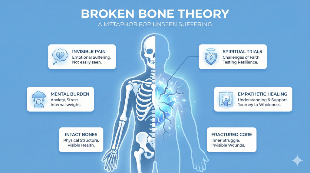 It also validates people whose struggles are invisible. Mental health struggles, emotional pain from loss, childhood trauma, relationship wounds — these leave no physical marks. The broken bone theory says: your invisible scars count. That validation matters enormously to people who have spent years feeling that their suffering is not real or not serious because they cannot point to a physical cause.