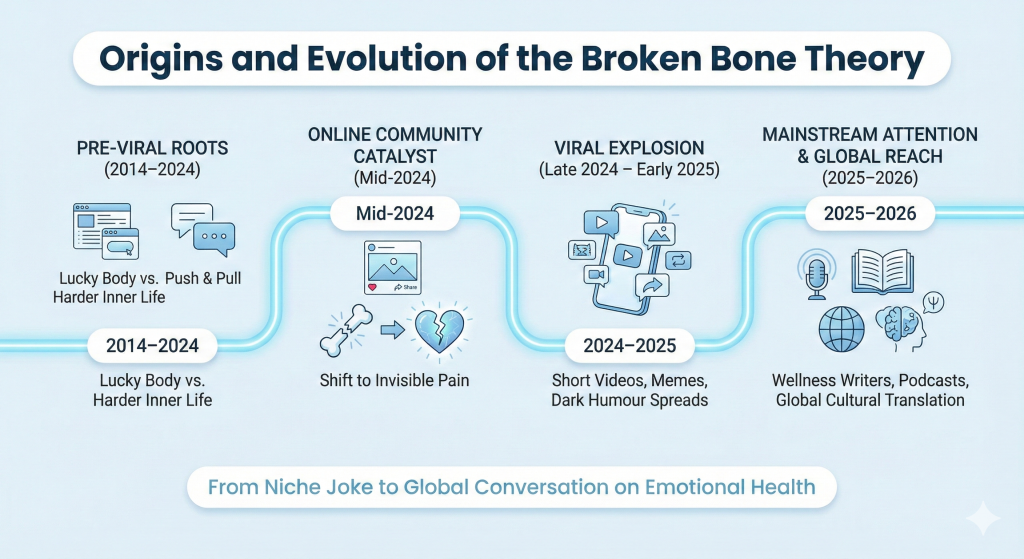 By 2025, the broken bone theory had moved well beyond social media. Wellness writers picked it up. Podcasters discussed it in long-form episodes about emotional health and invisible suffering. Mental health professionals began referencing it — sometimes critically, sometimes as a way to open conversations about pain that people struggle to name.